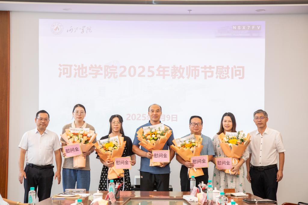甘毅、马少健为青年教师代表送上鲜花与慰问金。
