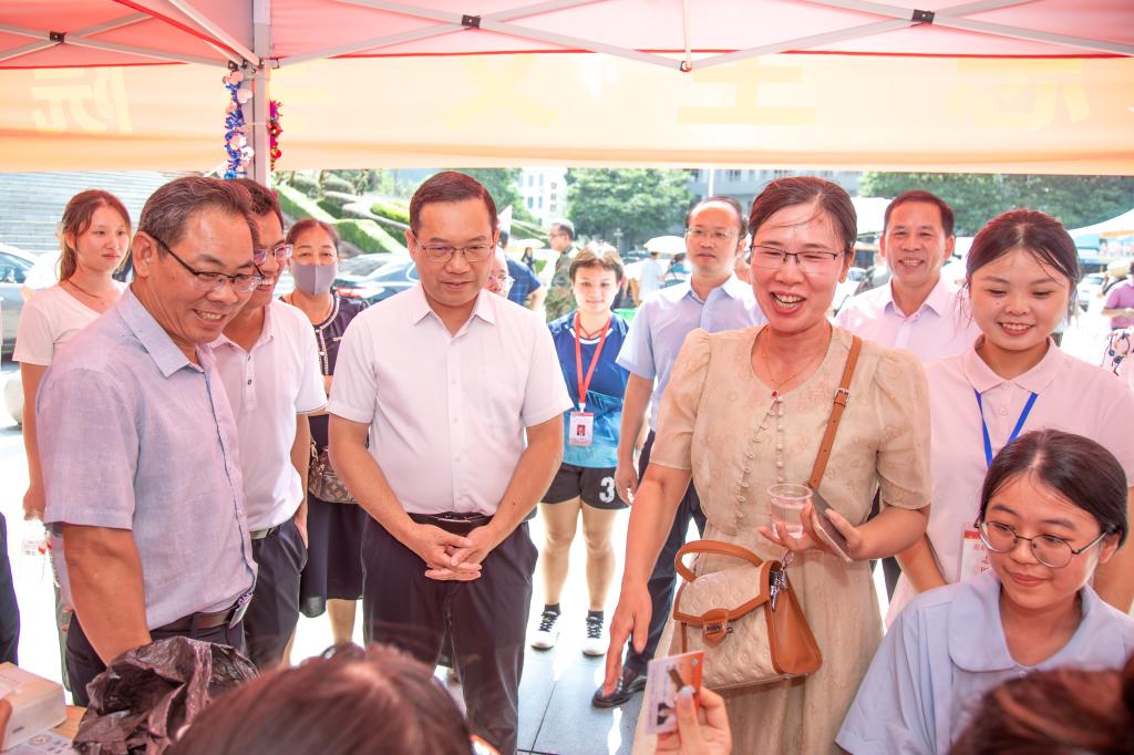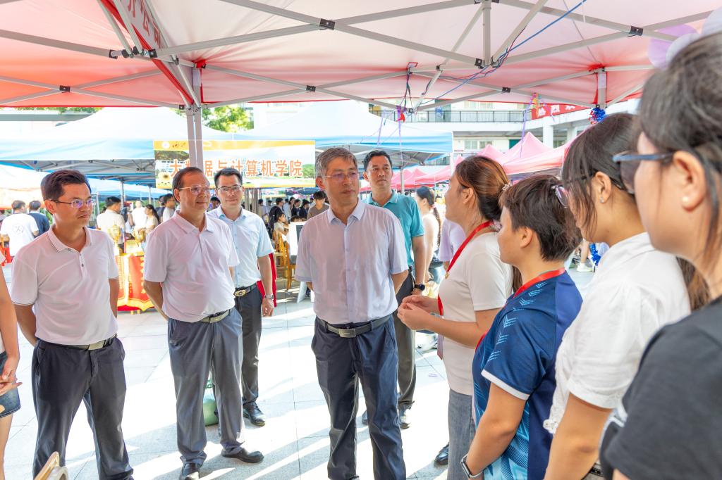 党委书记甘毅在逸夫楼广场看望报到新同学并慰问迎新工作人员。