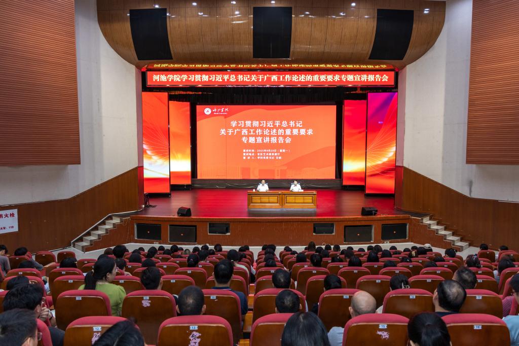 为深入学习宣传贯彻习近平总书记关于广西工作论述的重要要求,推动党的创新理论有效触达青年群体,9月29日下午,学校党委书记甘毅以《深入学习贯彻习近平总书记关于广西工作论述的重要要求,在新时代壮美广西建设中推动河池学院赶超式高质量发展》为题,在艺术楼表演厅主会场面向学校500余名青年师生代表开展理论宣讲。宣讲会由学校党委常委、宣传部部长李新富主持。