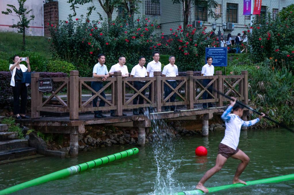 张鹏一行在独竹漂训练基地考察。