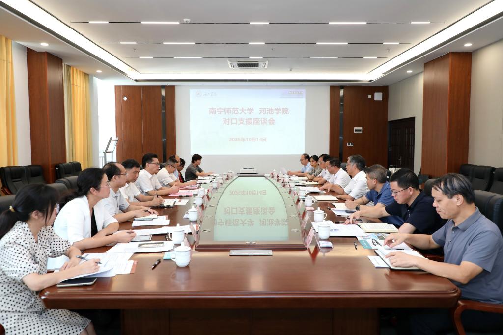 张鹏对我校的办学成果给予高度肯定。他指出,河池学院近年来发展步伐稳健,校园环境大幅改善,办学特色愈发鲜明,尤其在立足地方经济社会发展实际需求、强化学科专业建设方面成效显著,呈现出良好的发展态势。张鹏表示,南宁师范大学与河池学院均具备师范教育的深厚底色,在长期办学实践、学科专业布局与发展等方面拥有相似的探索经历与实践经验,为深化合作奠定了坚实基础。当前,国家正深入实施《教育强国建设规划纲要(2024—2035年)》,高校内涵式发展已成为核心任务。在此背景下,南宁师范大学将坚决落实教育厅关于对口支援工作的各项部署要求,针对河池学院的实际需求逐项开展专题研究,通过主动沟通、高效协作,以“责无旁贷、毫无保留、全力以赴”的态度推进各项支援工作,助力两校在教育教学、学科建设、科研创新等领域协同提升,共同实现高质量发展目标。