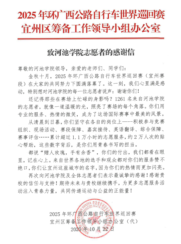 附:链接《我校1261名大学生志愿者全力护航2025年环广西公路自行车世界巡回赛https://news.hcnu.edu.cn/info/1154/39046.htm》