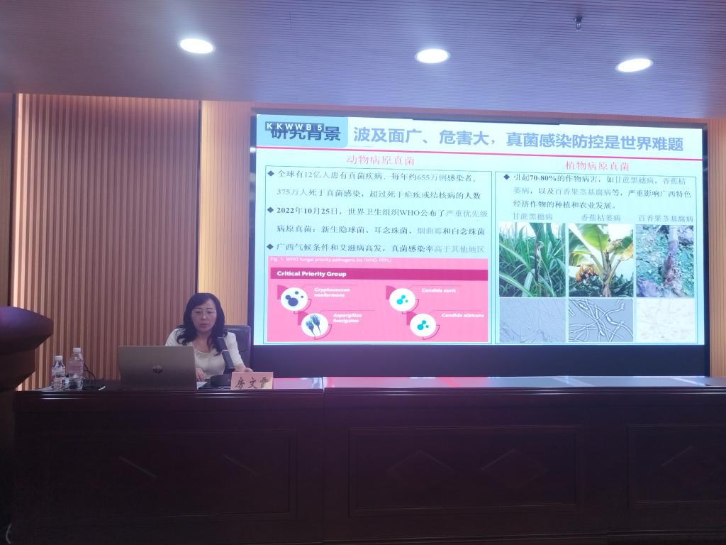 报告会上,房文霞围绕“病原真菌耐药性与新药开发” 这一前沿课题,系统介绍了课题组四大相辅相成的研究方向。她详解了病原真菌细胞壁及药物靶标的鉴定研究如何为新药研发提供精准靶点,阐述了广西喀斯特微生物资源的挖掘与利用如何依托地域特色破解资源瓶颈,剖析了真菌对环境碳源的适应性利用机制背后的生态逻辑,还介绍了真菌低毒病毒的挖掘及应用在生物防控领域的创新价值。每一个研究方向均配套高质量论文成果支撑,既有基础研究的理论深度,又兼具应用转化的实践价值,为师生展现了生物医学研究的完整链路。