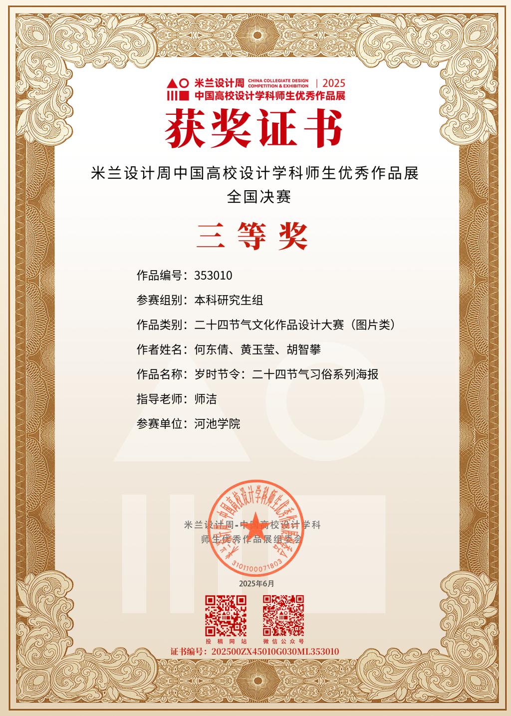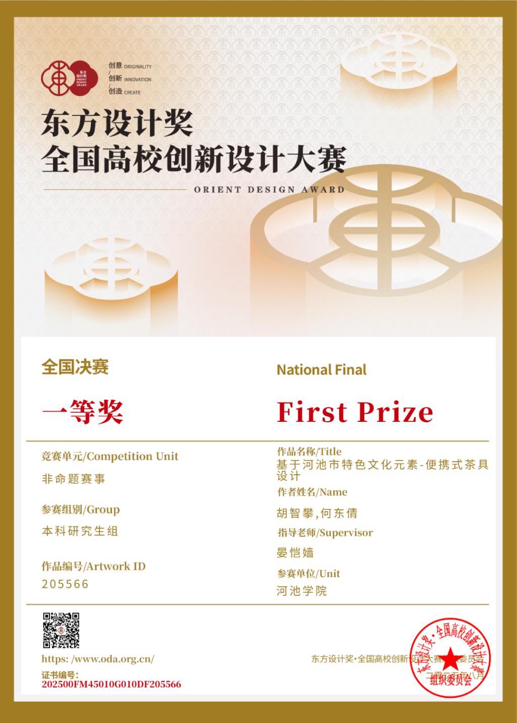 近日,我校美术与设计学院再传捷报,产品设计专业学子在两项全国性设计赛事的全国总决赛中脱颖而出,斩获多个奖项。由晏恺嫱老师指导,胡智攀、何东倩同学完成的作品《基于河池市特色文化元素-便携式茶具设计》荣获《东方设计奖全国高校创新设计大赛》全国总决赛一等奖;由黄莹老师指导,胡智攀、张玉彤同学创作的作品《基于仿生理念下的挖掘机造型设计》荣获《米兰设计周中国高校设计学科师生优秀作品展》全国总决赛二等奖;由师洁老师指导,何东倩、黄玉莹、胡智攀同学创作的作品《二十四节气文化作品设计大赛(图片类)》获《米兰设计周中国高校设计学科师生优秀作品展》全国总决赛三等奖。