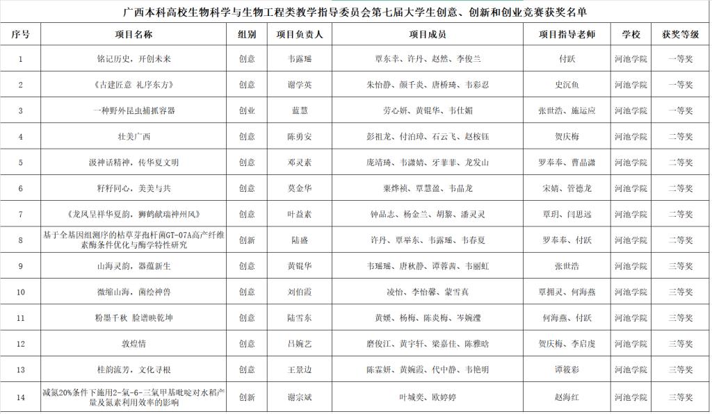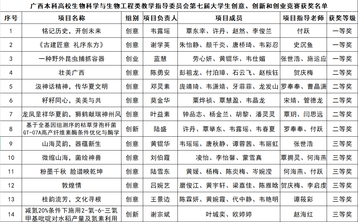 近日,广西本科高校生物科学与生物工程类教学指导委员会第七届大学生创意、创新和创业竞赛在桂林理工大学圆满落幕。我校由覃勇荣教授、贺庆梅老师带队参加比赛。经过激烈角逐,我校荣获优秀组织奖,并取得一等奖3项、二等奖5项、三等奖6项的优异成绩。