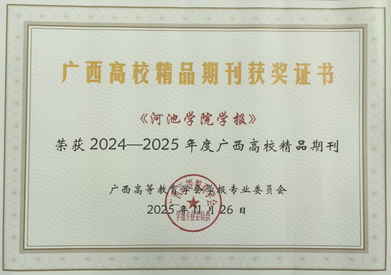 在本次评优活动中,我校喜获多项荣誉。其中,《河池学院学报》被评为2024-2025年度广西高校精品期刊,学报主编覃拥灵被评为2025年度广西高校学报优秀主编,学报编辑黄猛被评为2025年度广西高校学报优秀编辑。