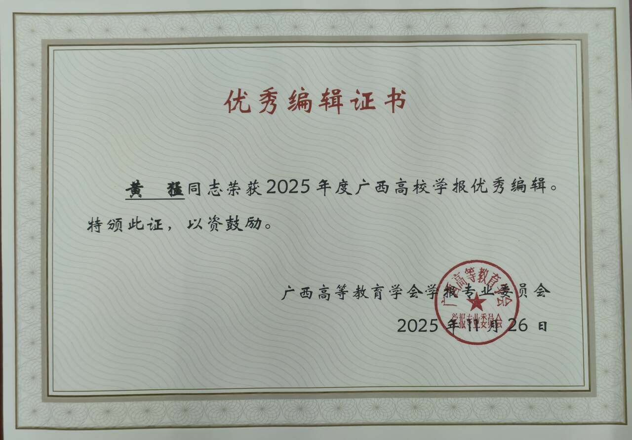 11月26日,由广西高等教育学会学报专业委员会举办的“广西高校学报2025年学术研讨会暨广西高校学报评优表彰大会”在崇左市举行。会议分为开幕式、颁奖、主题发言、分组讨论等环节,学报编辑部编辑黄猛代表我校学报参会。