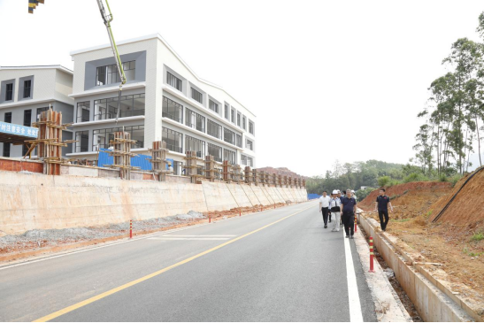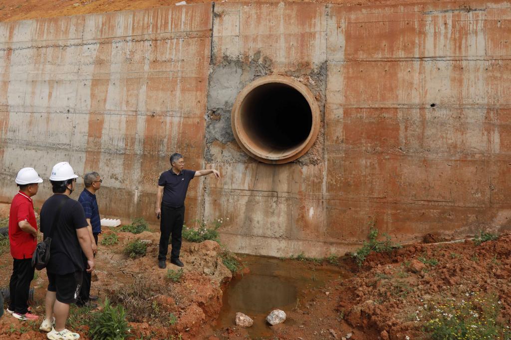 调研现场,马少健一行沿着新校区一期施工区域逐一察看,深入了解项目建设进展情况,现场协调解决项目推进过程中的难点堵点问题。在四组团B4教学楼桩基施工现场,询问现场人员有关地下溶洞问题处置流程和办法;在校内主干排水管道建设现场,了解最后一段管道接通S305改道涵管排水口的技术方案;在市政污水处理设施现场,重点查看管道铺设、雨污分流设计、管网接驳及污水处理工艺落实情况;在市政供电设施建设区域,认真查看线路敷设、配电设备布设等,掌握总控中心连接外电核心配套工程推进细节;在学生宿舍区,了解围墙、挡土墙、校内环道、体育运动设施、安全设施及周边环境建设情况,细致询问每一项工程进度、质量管控、安全管理、成本把控等情况,现场梳理施工过程中存在的问题,要求相关部门明确整改方向与推进时限,对后续工程建设提出具体指导意见。