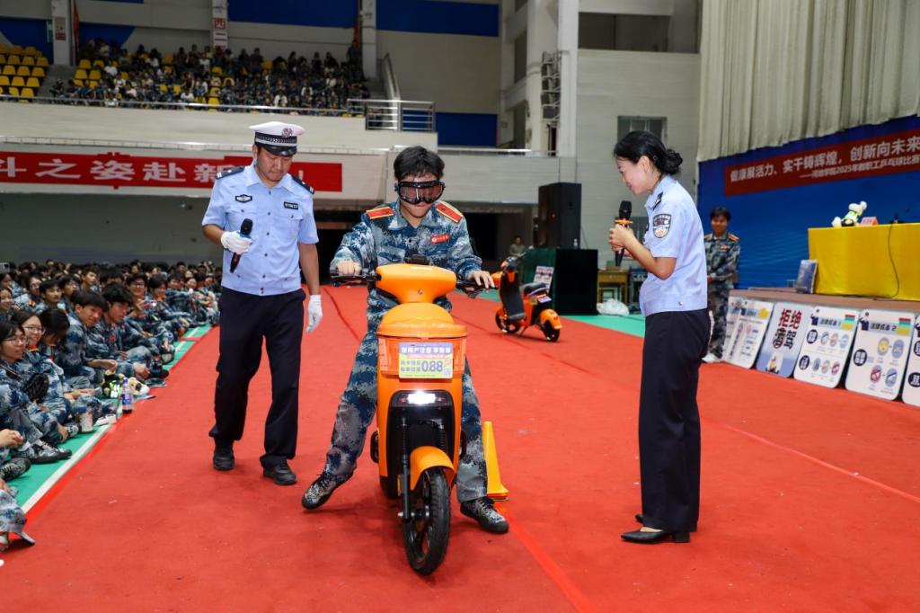 张雪艳结合当前河池市道路交通安全形势,通过真实案例剖析与法律法规讲解,重点阐述了“鬼探头”、未佩戴头盔、违规载人、闯红灯、逆行等常见违法行为引发的交通事故后果,进一步增强同学们的交通安全意识。讲座还设置了知识问答、共享单车规范骑行演示、酒精VR眼镜体验等互动环节,在交警的指导下,同学们积极参与,现场气氛热烈。