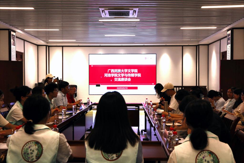 9月27日,广西民族大学文学院党委副书记吴先源带领师生到我校文学与传媒学院座谈交流,深化在文学创作与人才培养领域的交流与合作。文学与传媒学院党委书记欧阳珍以及相关师生参加座谈。