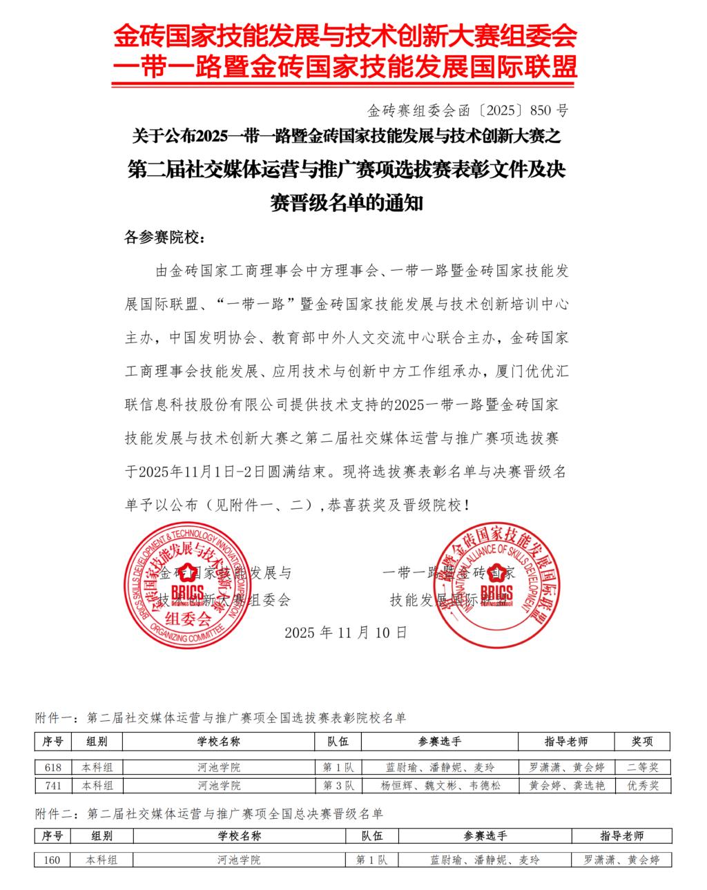 近日,2025一带一路暨金砖国家技能发展与技术创新大赛第二届社交媒体运营与推广赛项全国选拔赛(本科组)表彰文件及决赛晋级名单正式公布,我校外国语学院2023级商务英语专业蓝尉瑜、潘静妮、麦玲团队斩获二等奖并晋级全国总决赛,2024级商务英语专业杨恒辉、魏文彬、韦德松团队荣获优秀奖。