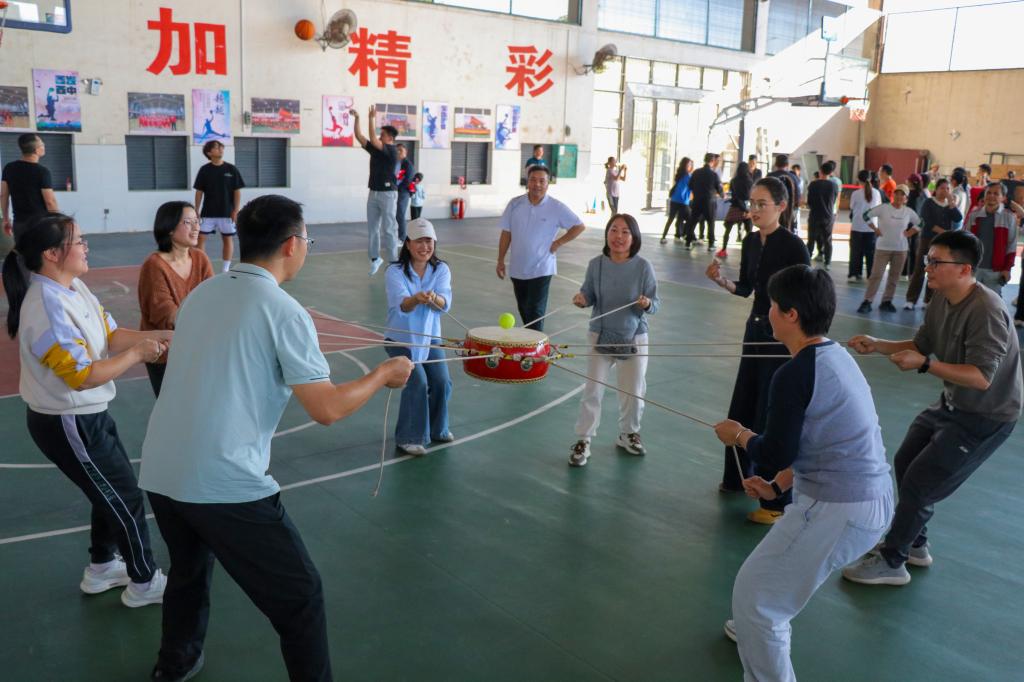 运动会设置了背篓绣球、滚铁环、旱地龙舟、运球上篮、众人击鼓、无敌风火轮等六个集趣味性、协作性和竞争性于一体的比赛项目。赛场上,老师们暂别繁忙的工作,全身心投入比赛。“投绣球”的精准默契、“滚铁环”的紧张刺激、“旱地龙舟”的步调一致、“无敌风火轮”的齐力前行,每一个项目既是对个人技巧的考验,更是对团队协作与信任的锤炼。现场加油声、欢笑声、喝彩声此起彼伏,气氛热烈而融洽。