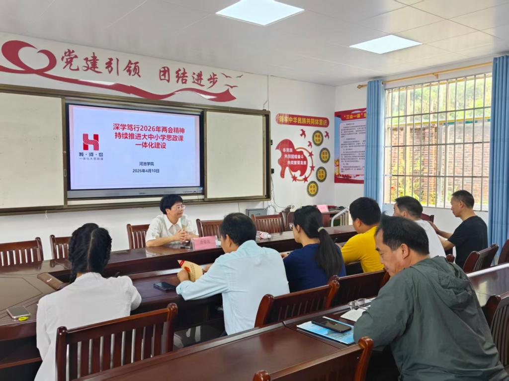 4月10日,马克思主义学院唐菊花副教授和朱汉卿博士到宜州区祥贝中学宣讲2026年全国两会精神,并与初中思政课教师及班主任围绕构建思政教育共同体、学段教学衔接、运用本土优质资源合力共建大课堂等议题进行研讨,共绘乡村思政育人新图景。