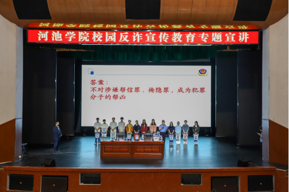 为进一步提升全校师生防范电信网络诈骗的意识和能力,筑牢校园反诈安全防线,切实守护师生财产安全,共建平安和谐校园,4月22日,我校联合河池市公安局反诈中心成功开展“筑牢反诈防线,共建平安校园”校园电信网络诈骗宣传教育活动。