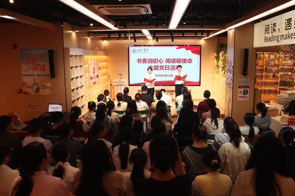 当天上午,学院党委联合宜州区新华书店举办“书香润初心 阅读砺使命”主题党日活动,活动在宜州区新华书店进行,学院领导、辅导员及全体学生党员参加活动。活动伊始,学院副院长张明进致开幕词,勉励党员将读书作为政治责任与精神追求。随后,师生共同观看《习近平的读书故事》微视频,精读《习近平著作选读》等红色文献,在沉浸式学习中感悟思想伟力。交流研讨环节,党员代表结合阅读心得畅谈青年使命;学院还向党员代表赠送红色书籍,鼓励大家以学铸魂、以学促干。最后,学院院长江洪明作总结讲话,号召师生深耕理论经典,坚持终身阅读,以青春之力担当时代使命。