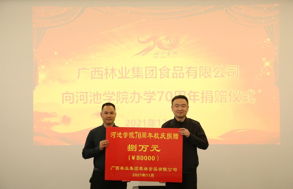 12月2日下午,广西林业集团森林食品有限公司副总经理覃家欣来到我校,代表公司向我校70周年校庆捐赠8万元。捐赠仪式在西区实训楼1507会议室举行,校长苗剑出席捐赠仪式并为其颁发捐赠证书。