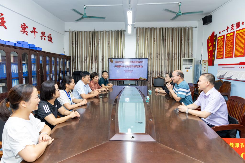 在第41个教师节来临之际,学校党委书记甘毅、校长马少健,党委常委、副校长覃拥灵,副校长贺卫国,党委常委、副校长苏安等校领导分别率队赴宜州区保育院、宜州区实验小学、宜州区民族中学等14所幼儿园、中小学开展教师节慰问活动。