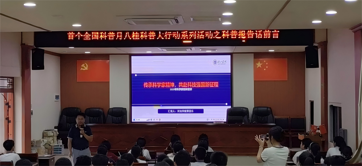 9月8日,在首个“全国科普月·八桂科普大行动”系列活动中,宜州区科协委托我校广西科学家精神宣讲团成员覃国乐,前往宜州区民族中学开展“传承科学家精神,共赴科技强国新征程”主题科普宣讲活动,活动吸引了110多名师生参与。