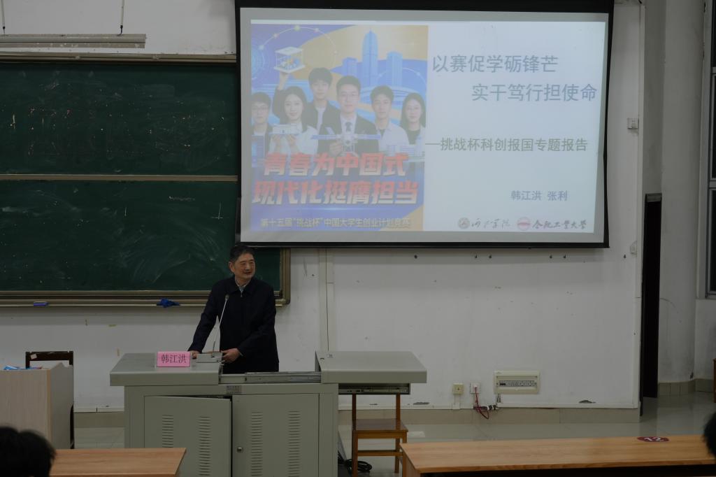 3月25日,大数据与计算机学院在弘毅楼1-101教室依托“我・河・你”一体化大思政课实践育人平台,举办“挑战杯”科创报国专题报告会。合肥工业大学银龄教授韩江洪、张利应邀担任主讲,学院副院长吴启明主持活动,学院300余名大二学生参加。